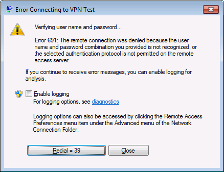 Beskrivelse: Den fjerne forbindelse blev nægtet, da brugernavn og password kombinationen du gav, ikke genkendes, eller den valgte verifikationsprotokol er ikke tilladt på den fjerne server.