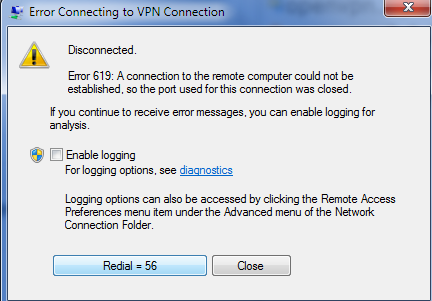 Løsning: Denne fejlkode dukker op, når klientenheden har mistet sin forbindelse til et lokalt netværk; en netværksfirewall blokerer VPN-trafik; eller brugeren har skrevet et forkerte navn/adresse for VPN-serveren. Sikre dig, at du har de rigtige VPN-server informationer. Hvis alt er fint, så sikre dig at din firewall ikke er konfigureret til at blokere VPN-forbindelser. En firewall opgradering til at specificere hvilket port nummer din VPN bruger, kan være nødvendigt.
